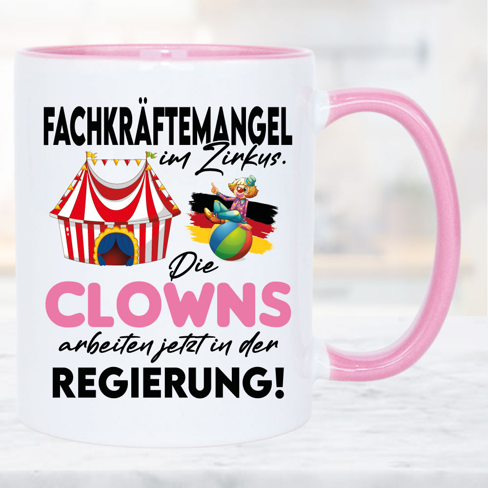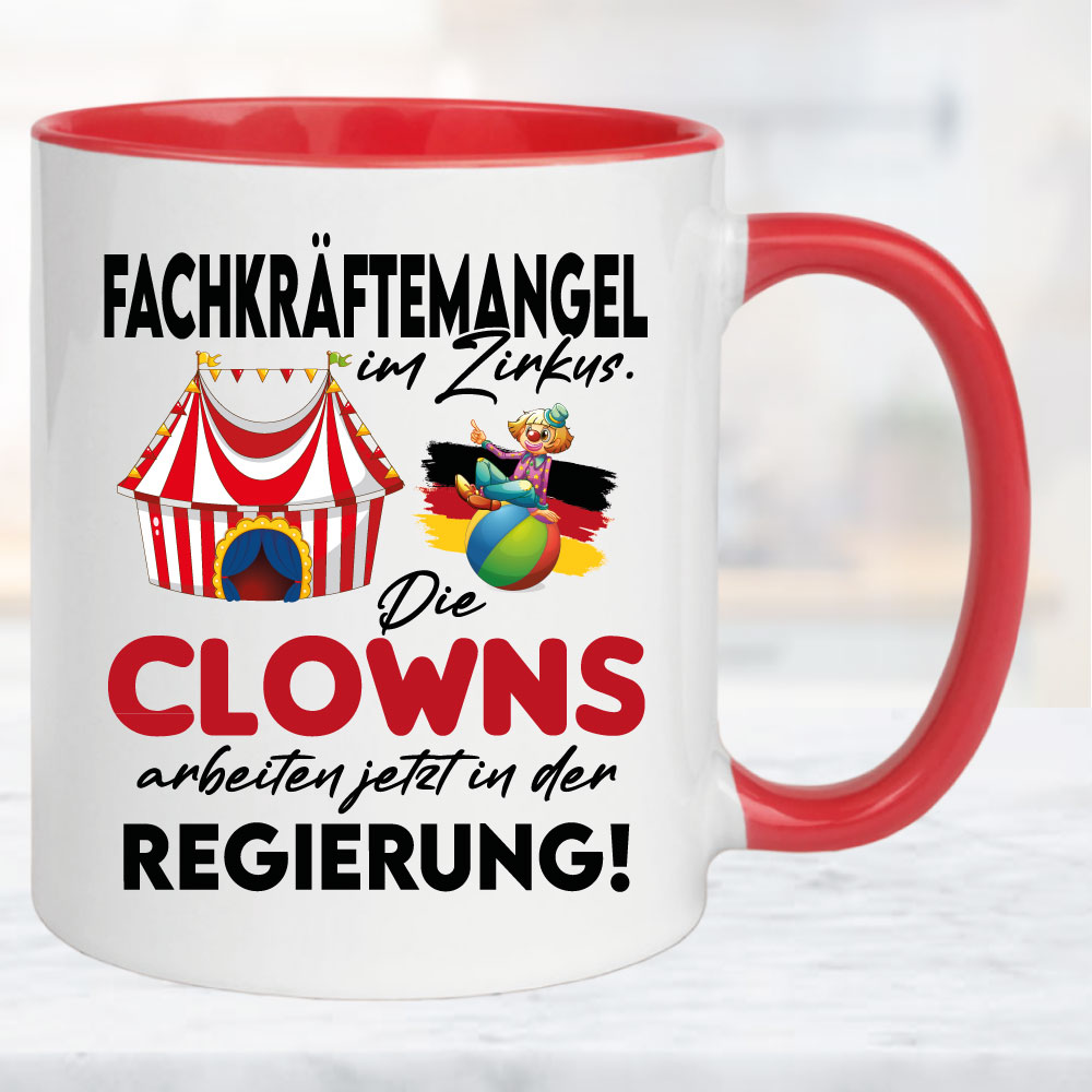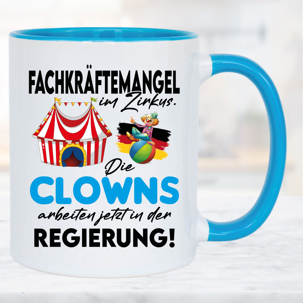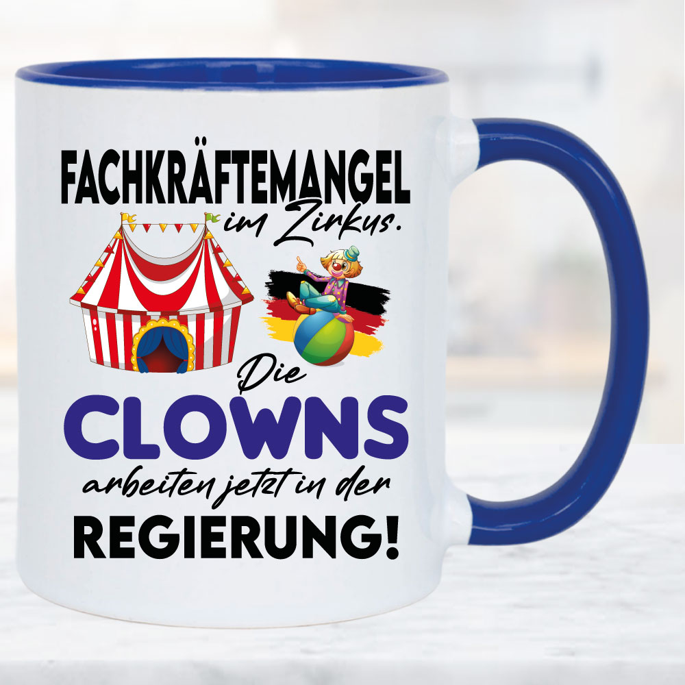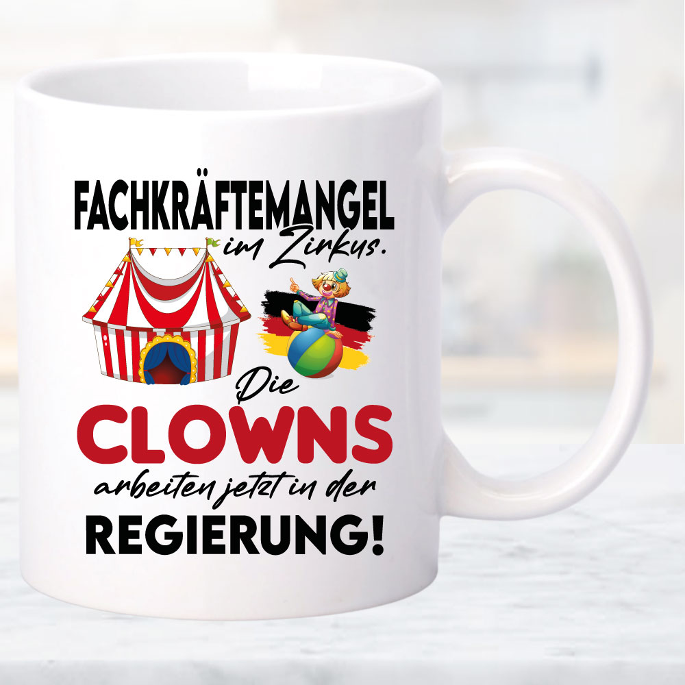 Clowns sitzen jetzt in der Regierung. Tasse zur schlechten Politik im Bundestag. Wählen sie ihre Tassengröße und Farbe. Auch für Mikrowelle und Spülmaschine geeignet. Hochglanzdruck. Tassenfüllmenge 330 – 450ml.