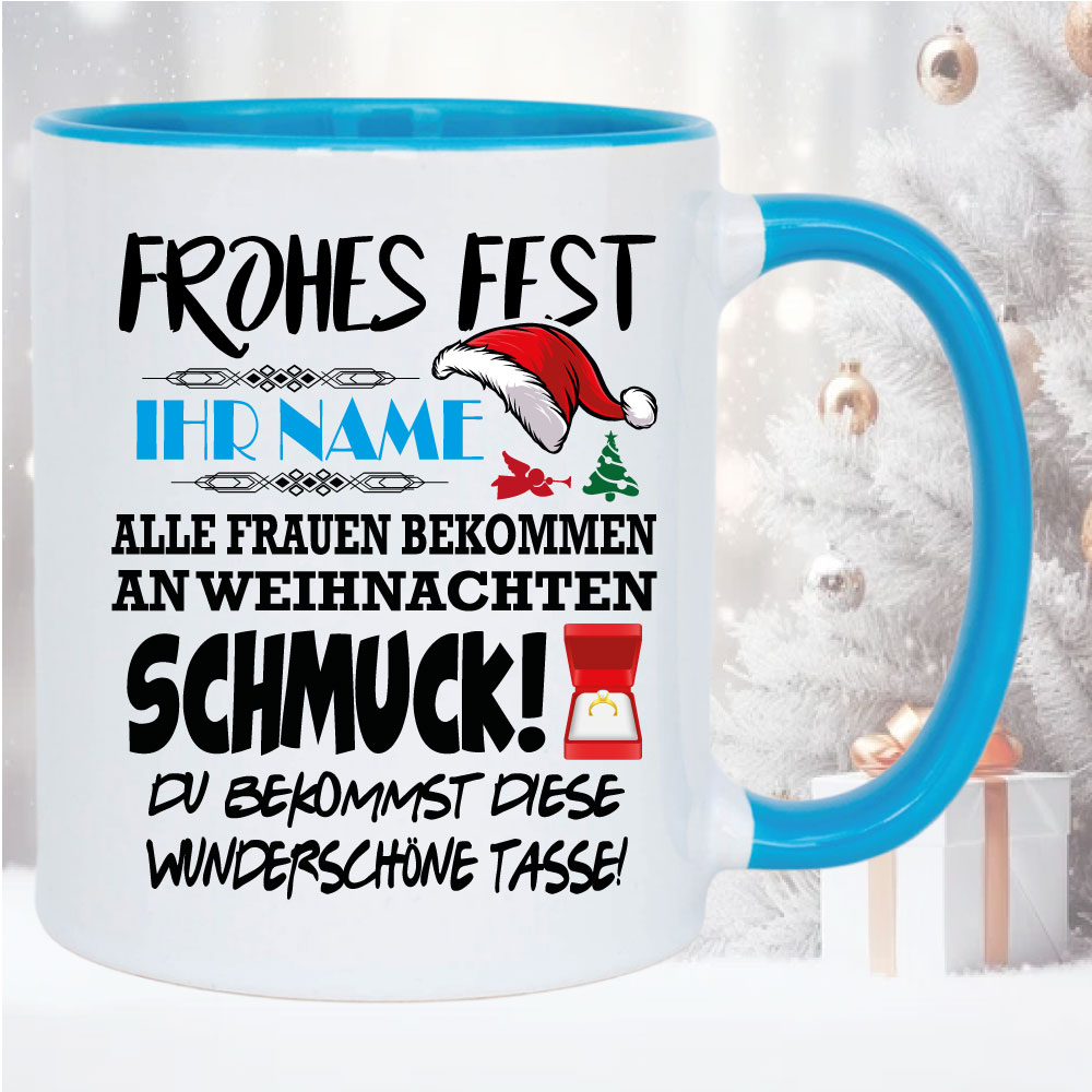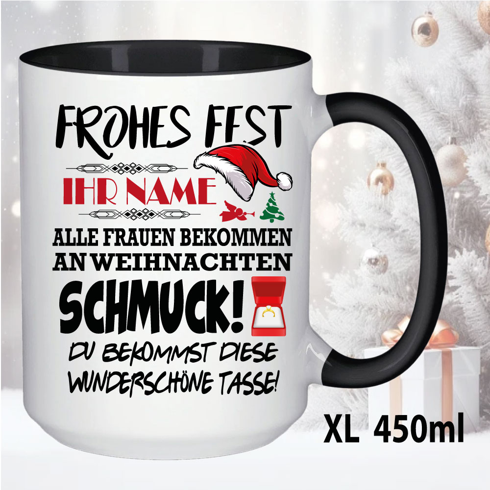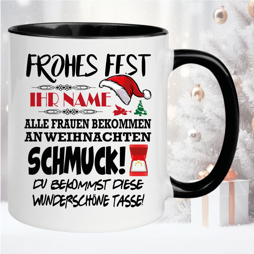 Geschenketasse zum Weihnachtsfest. Wählen sie ihre Farbe und Größe aus, und tragen sie ihren Namen ein. Auch für Mikrowelle und Spülmaschine geeignet. Hochglanzdruck.