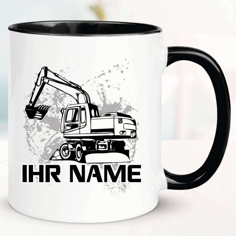 Schwarze Tasse mit Bagger und Name bedruckt.